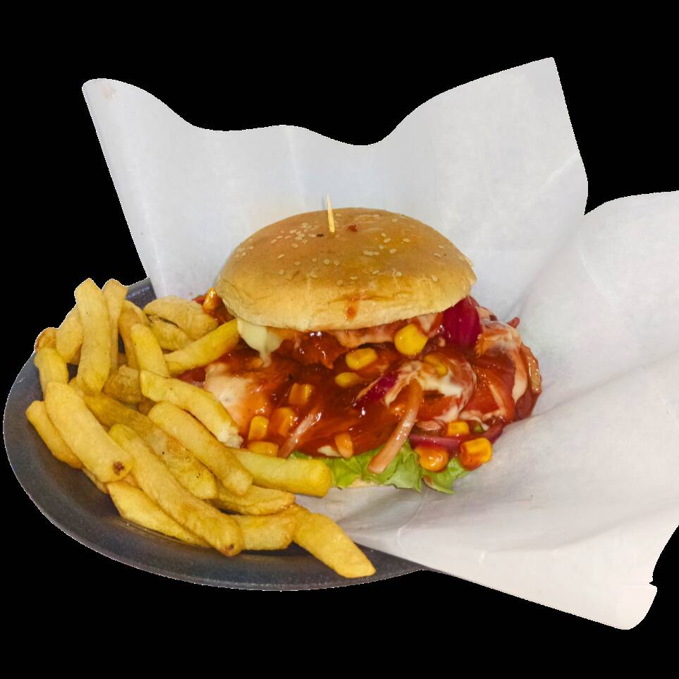 170 gr de proteína vegetal (lentejas o garbanzo + seitán), maíz tierno, champiñones, pimentón, cebollas, pan artesanal, salsas de la casa. Acompañado de 150 gr de papa a la francesa