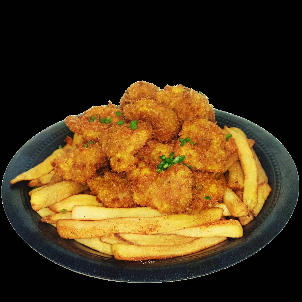 Camarones tigre tempurizado en panko con papa a la francesa.