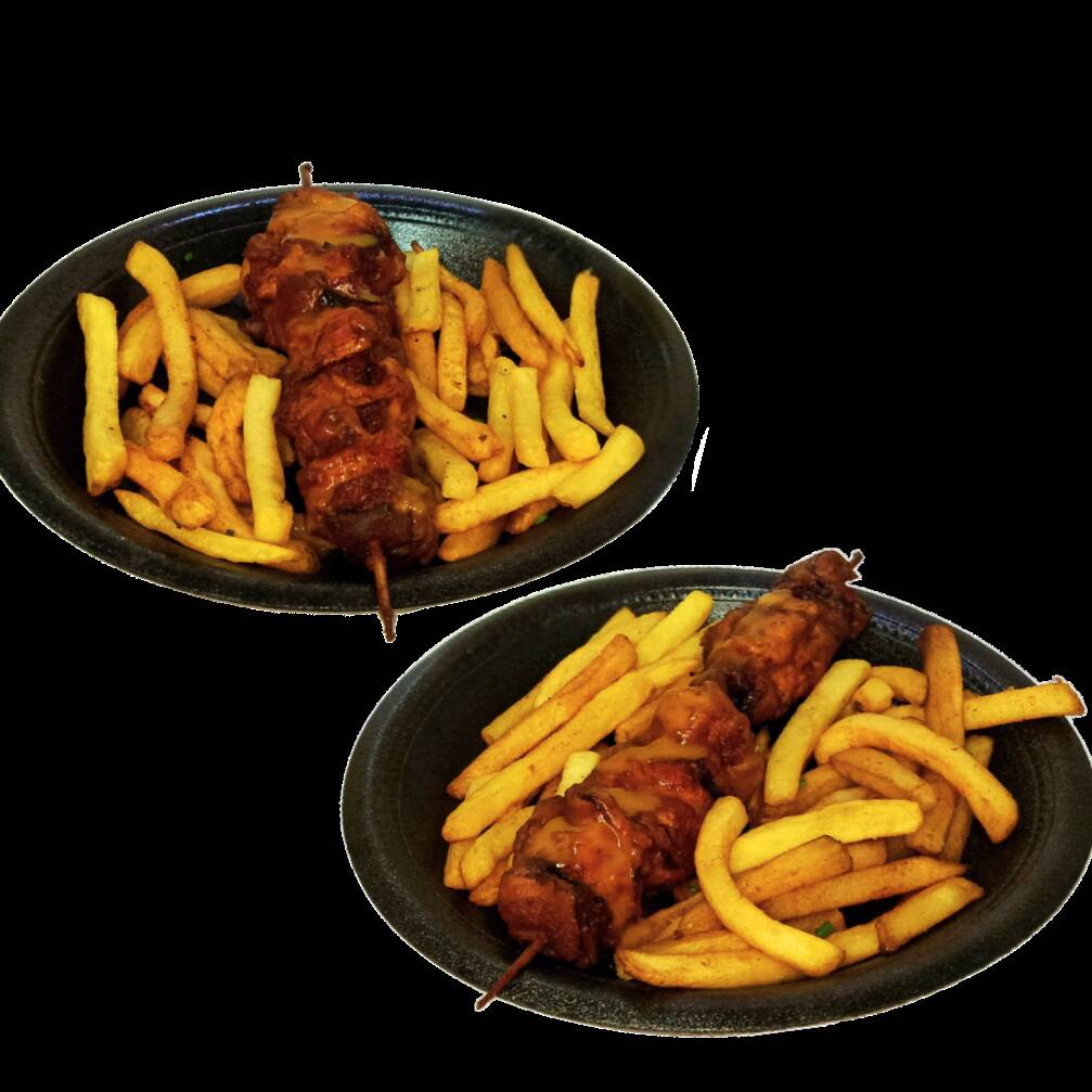 DOS brochetas de cerdo o pollo tempurizadas. Acompañadas de 2 porciones de papa a la francesa + 2 gaseosas postobon 400 ml