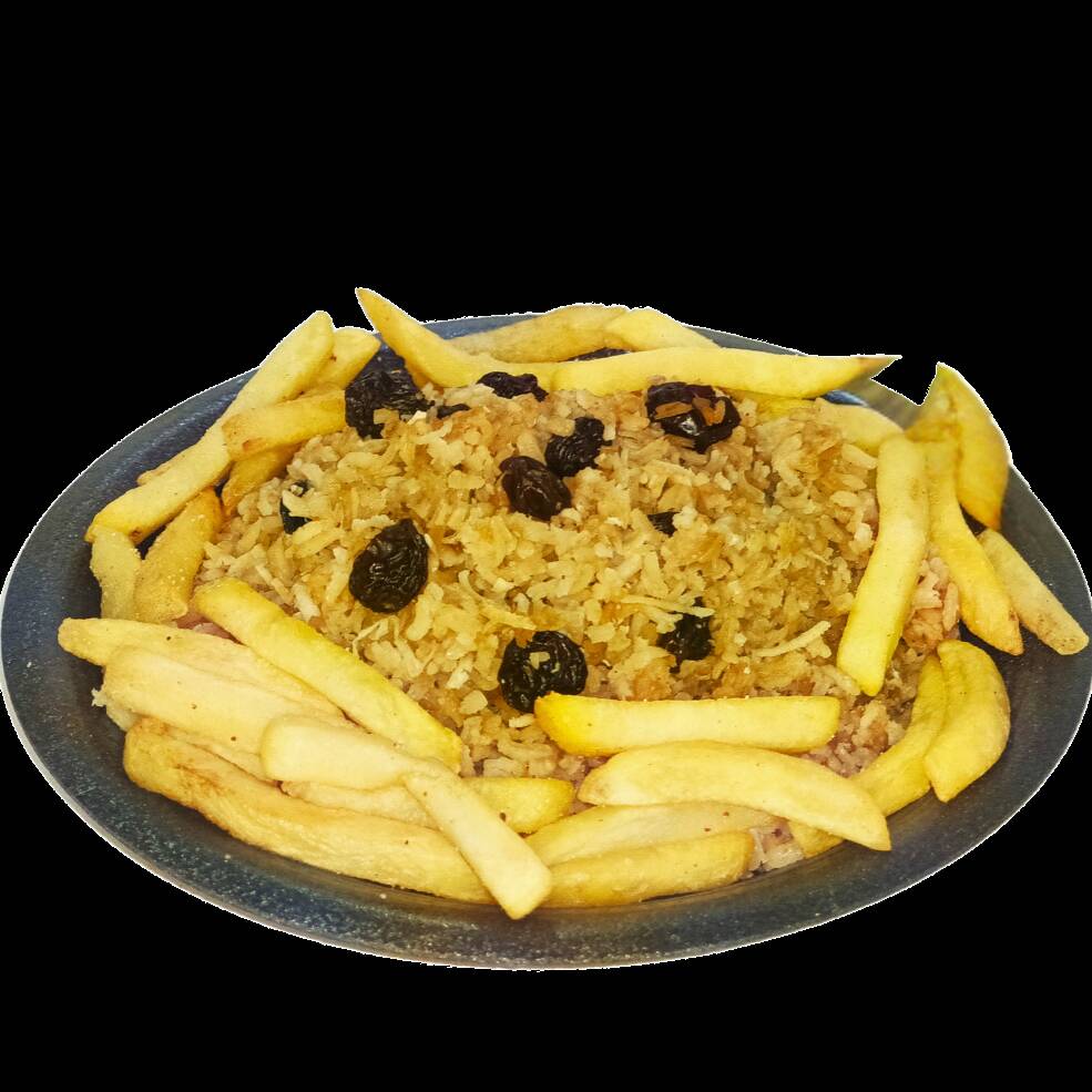 Arroz con coco, uvas pasas, leche de coco y papa a la francesa.