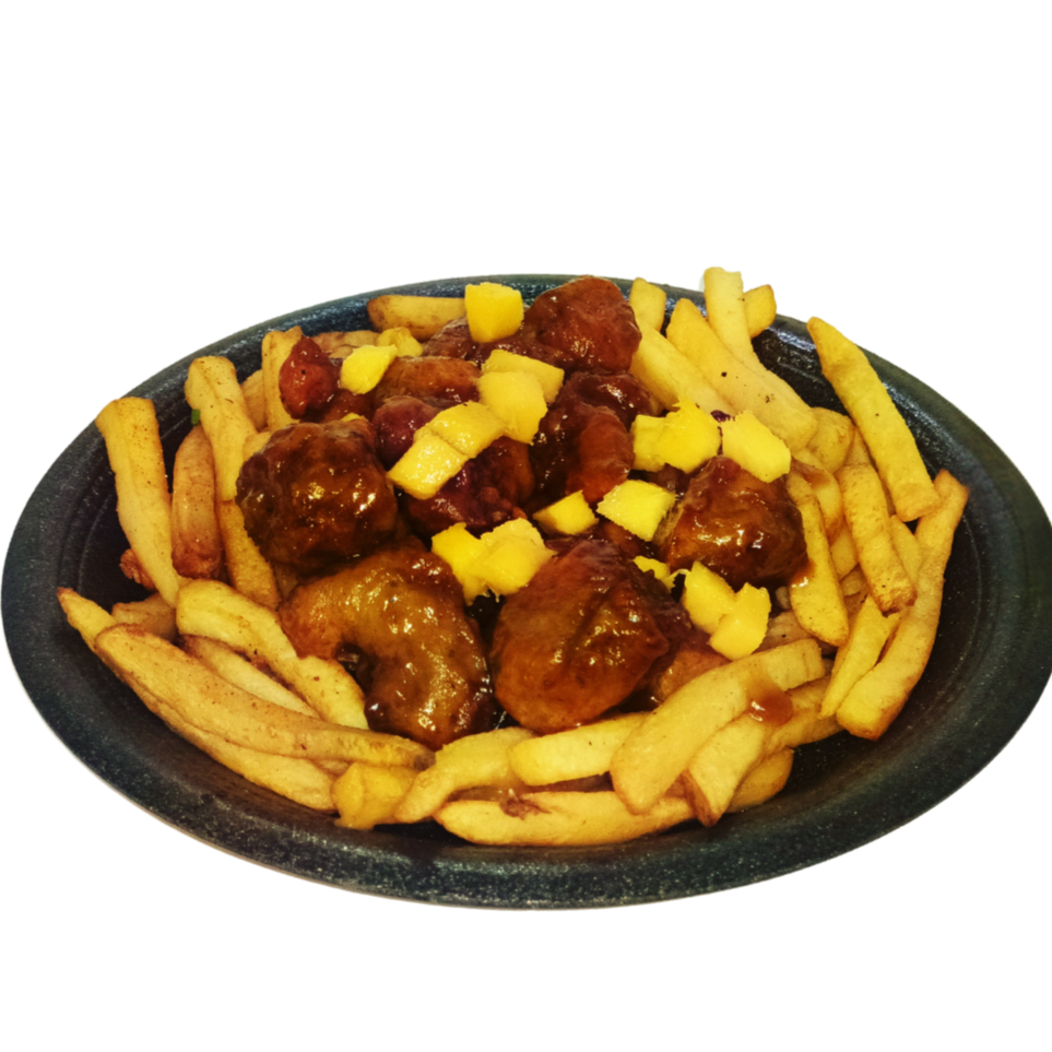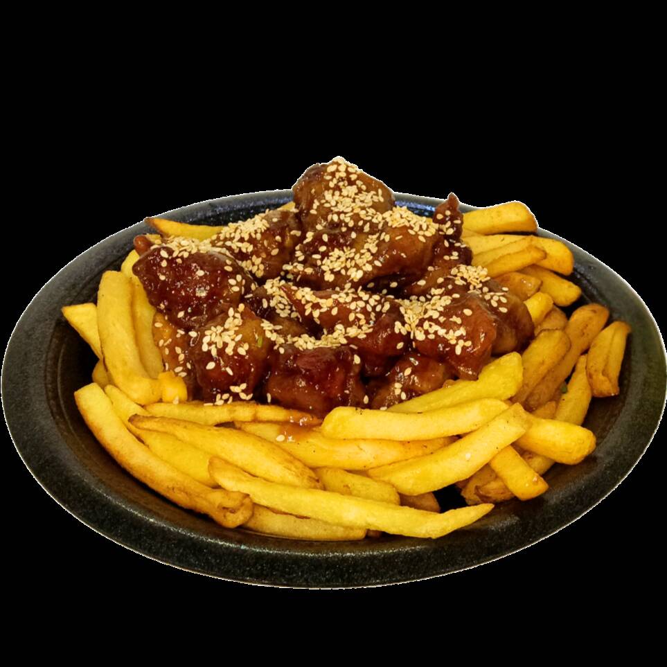 250 Gramos de lomo de cerdo tempurizado en salsa de mango tommy con papa a la francesa.