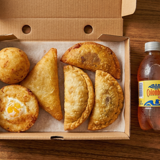 2 Papas rellenas, 1 pastel de yuca, 1 arepa de huevo, 6 empanadas y 2 gaseosas 250 ml elige a tu gusto (manzana, cuatro, Colombiana).