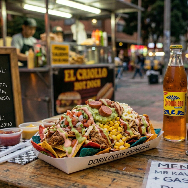Carne y pollo desmechados, maíz tierno, chorizo de cerdo, pincho de pollo, jamón, queso, tocineta, papa chip y salsas de la casa.
