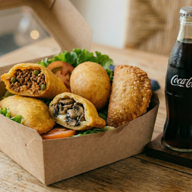 4 Empanadas (carne, pollo, mixta, champiñones) más 1 gaseosa 250 ml elige a tu gusto (manzana, cuatro, Colombiana).