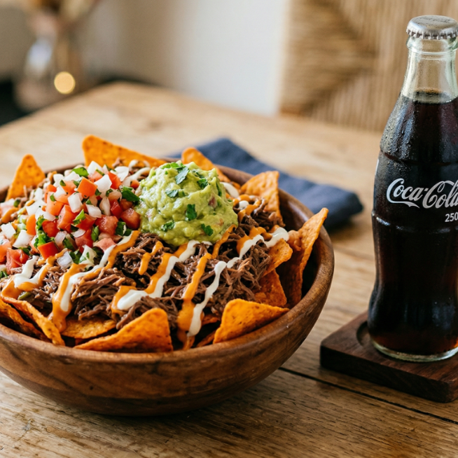 Doritos, carne desmechada, pico de gallo, guacamole y salsas de la casa más gaseosa 250 ml elige a tu gusto (manzana, Pepsi, Colombiana).