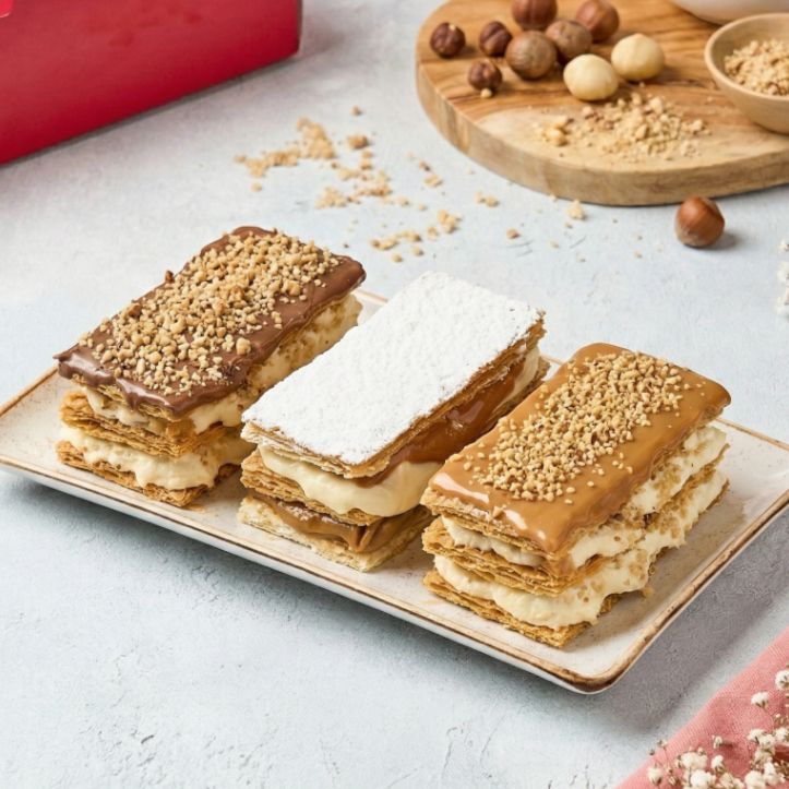 Si eres fan del chocolate, es tu oportunidad de disfrutar estas tres deliciosas variaciones de milhojas. Nuestro nuevo sabor rocher: chocolate negro y frutos secos, Tayrona: la delicadeza del chocolate blanco con macadamia y relleno de limon, y Chocolove: la dulce tentación de chocolate con fresas.