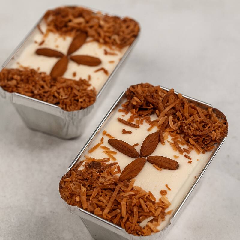 Flan de caramelo, dulce de coco y almendra tostada. Tamaño de 4 oz.