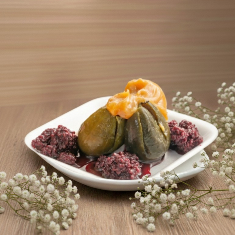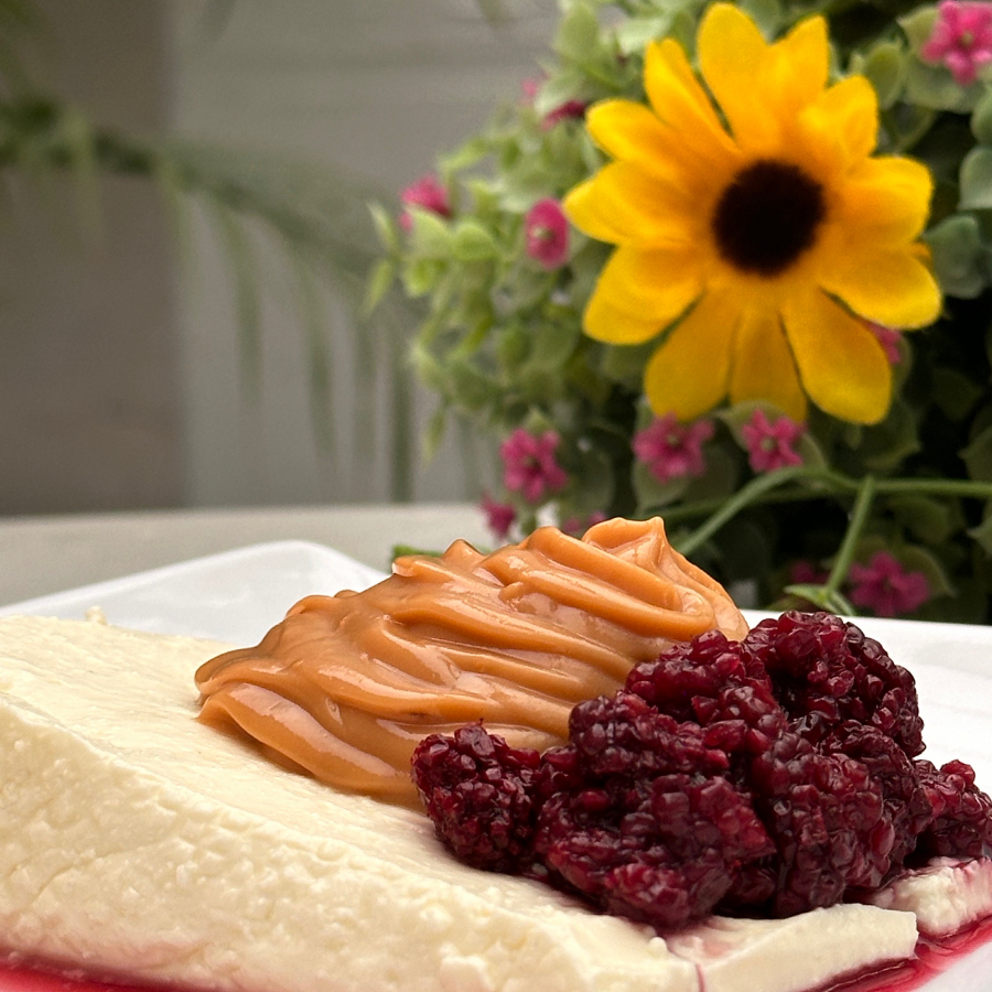 Horneado de guanábana con flan, acompañado de un delicioso dulce de mora. Tamaño de 4 onzas.