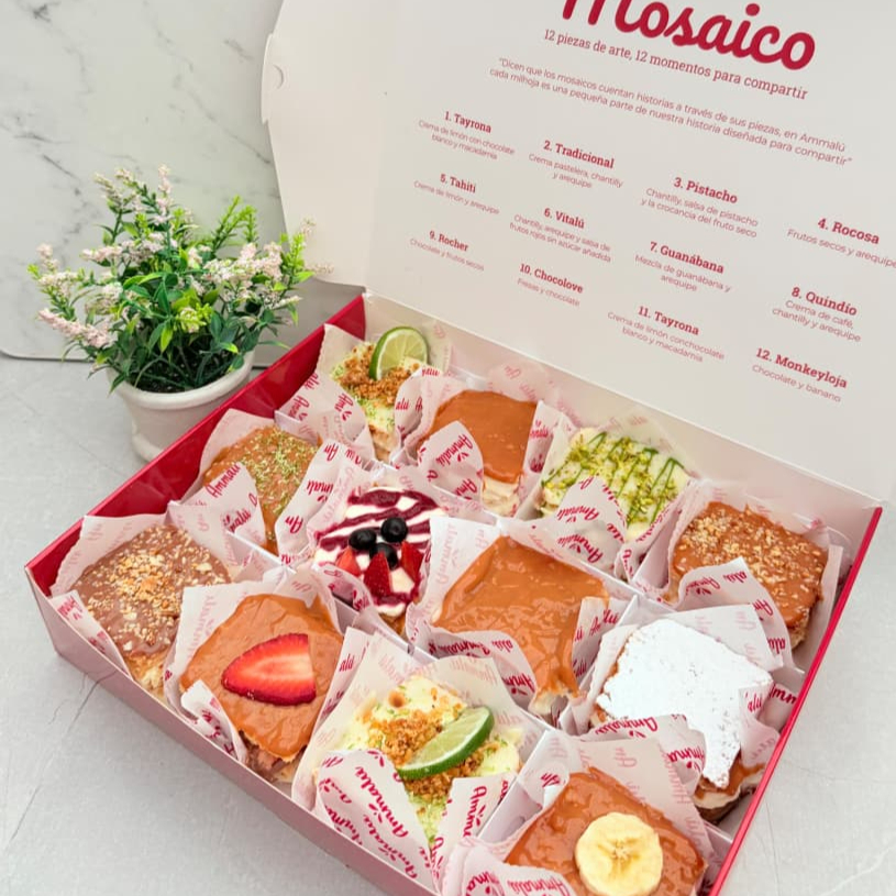 Mosaico comestible de 6 mini milhojas cuenta una historia diferente: 🍋 Tayrona 🥜 Rocher 🍌Monkeyloja 🍓Chocolove 🍈Guanábana 🥛 Tradicional Dimensiones: 5.5 de largo, 6 de ancho y 4 de alto.