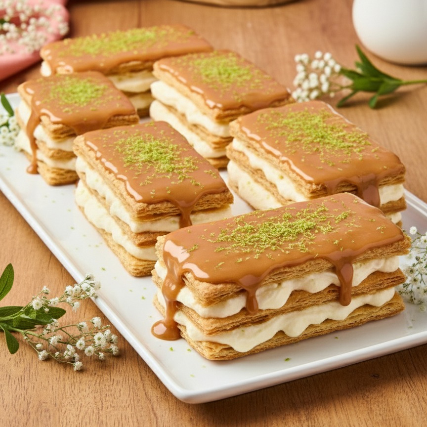 Capas de hojaldre crujiente, rellenas con chantilly, crema infusionada con café de origen, arequipe artesanal y acompañado de un velo blanco de dulzura.
