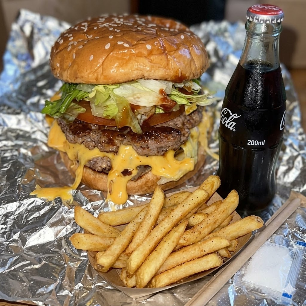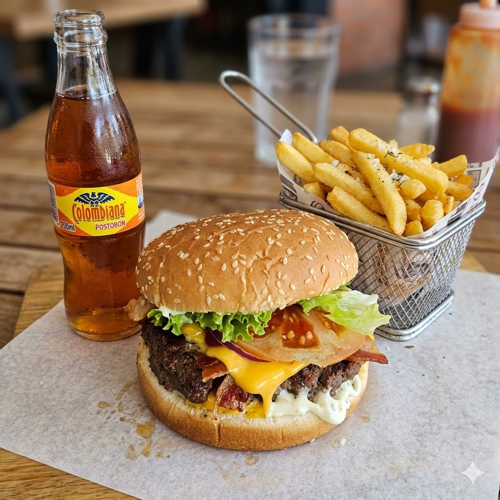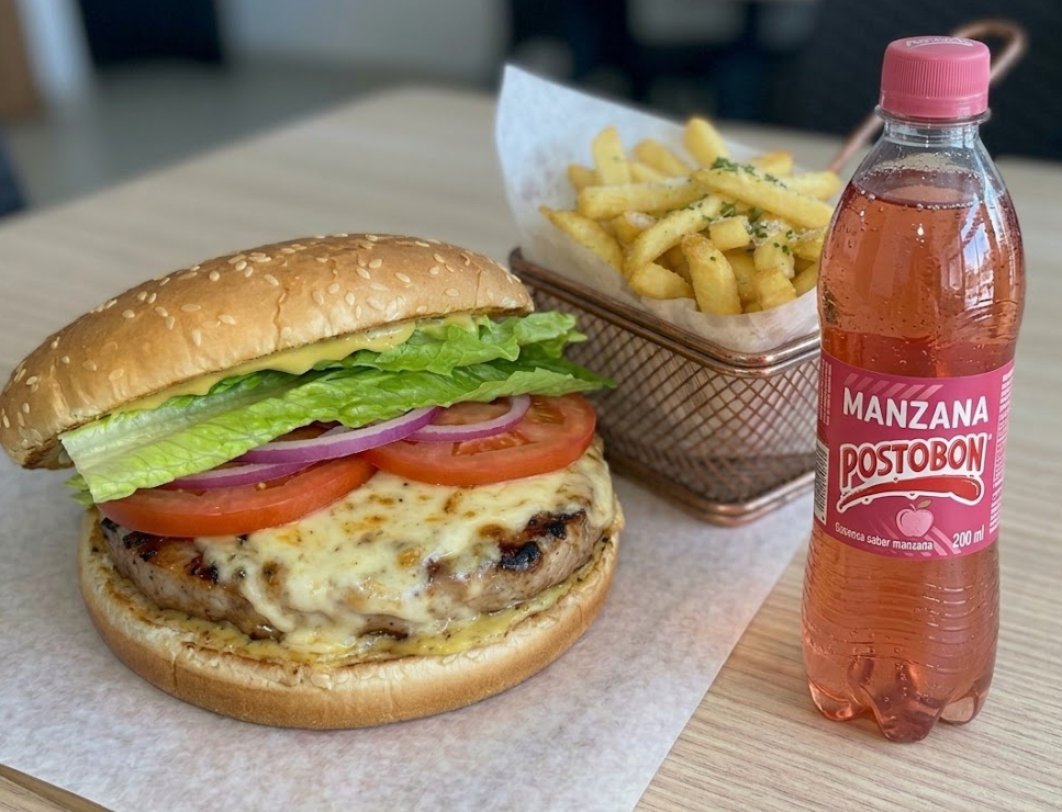 Hamburguesa sencilla (Carne de res premium, vegetales frescos, tomate y lechuga y queso fundido) + papas a la francesa + gaseosa 250 ml (Colombiana, manzana, uva)