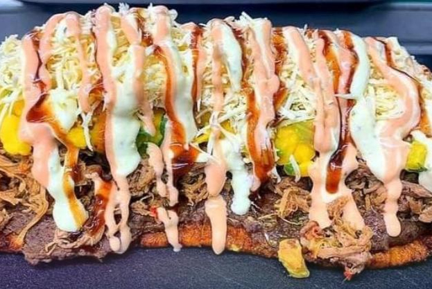 Sabores de la granja. Carne de res, maduro dulce, carne desmechada, maíz y queso. ¡El toque dulce y salado perfecto!