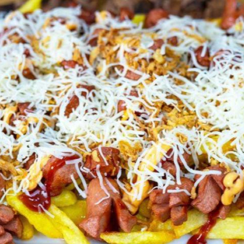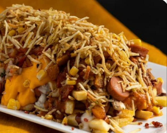 La mezcla perfecta. Papas, carne desmechada, pollo, salchicha, tocino y queso derretido. ¡Prueba un poco de todo!