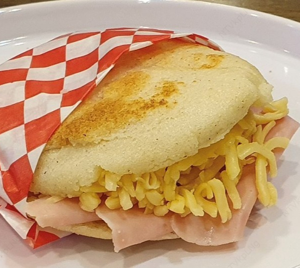 Arepa rellena del famoso pabellón: carne, frijol, huevo, queso rayado y tajada de plátano maduro.