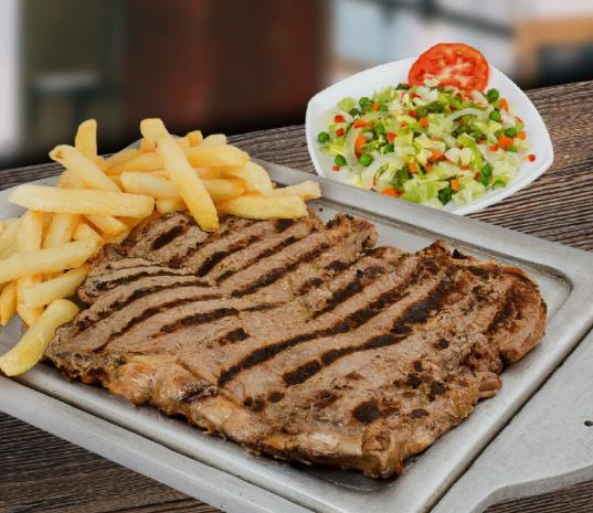 Jugoso corte de carne a la parrilla. Acompañado de papa (francesa o casco), ensalada criolla, yuca y guacamole.