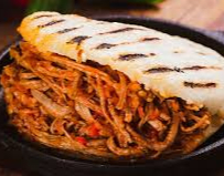 Arepa rellena con jugosa carne desmechada y queso rayado.
