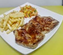 Costilla de cerdo con un glaseado de miel mostaza. Acompañado de papa (francesa o casco), ensalada criolla, yuca y guacamole.