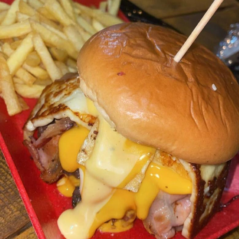 Una explosión de sabor. Carne de res, tocineta, chicharrón crocante y vegetales frescos. ¡Una experiencia única!