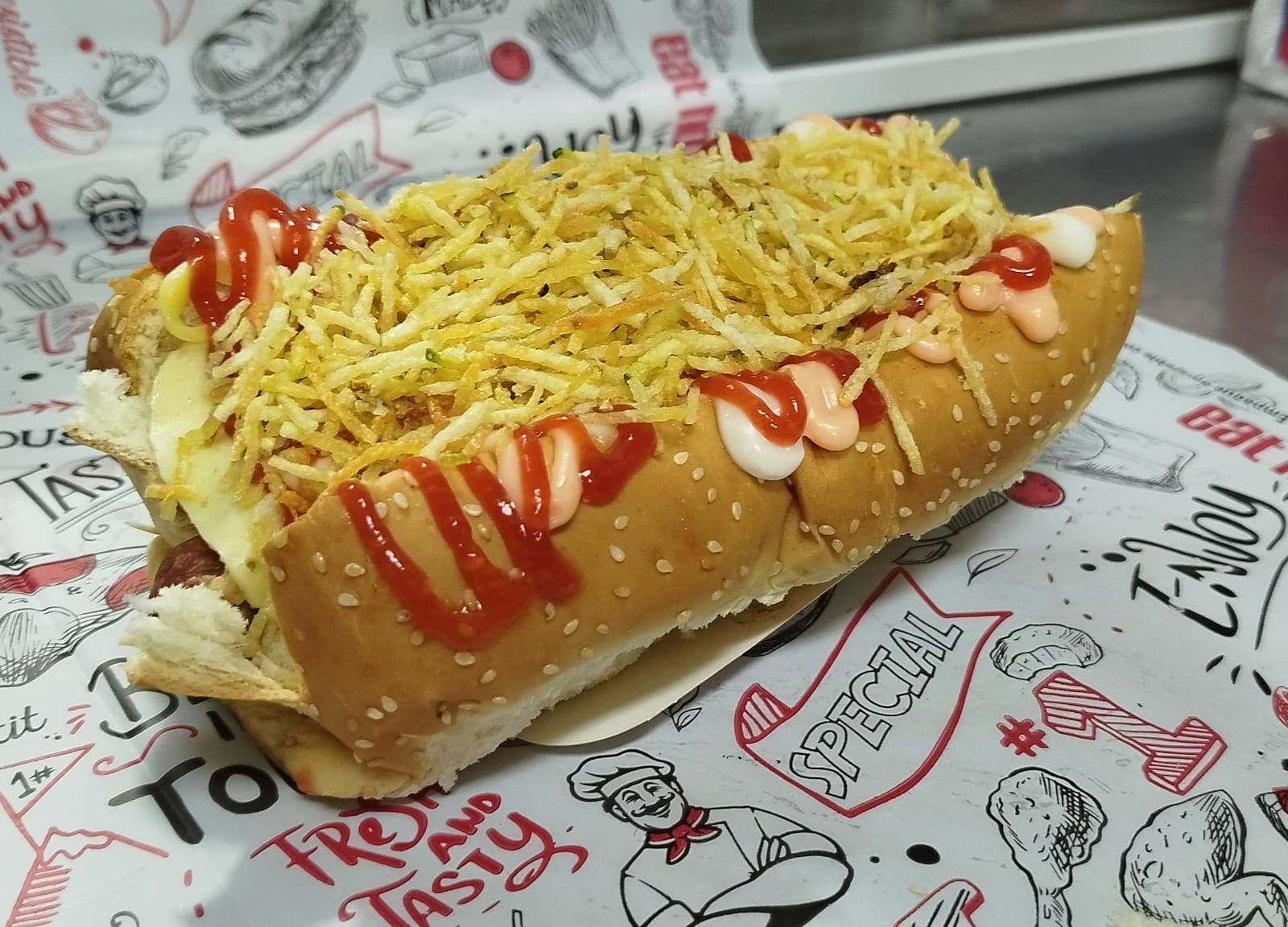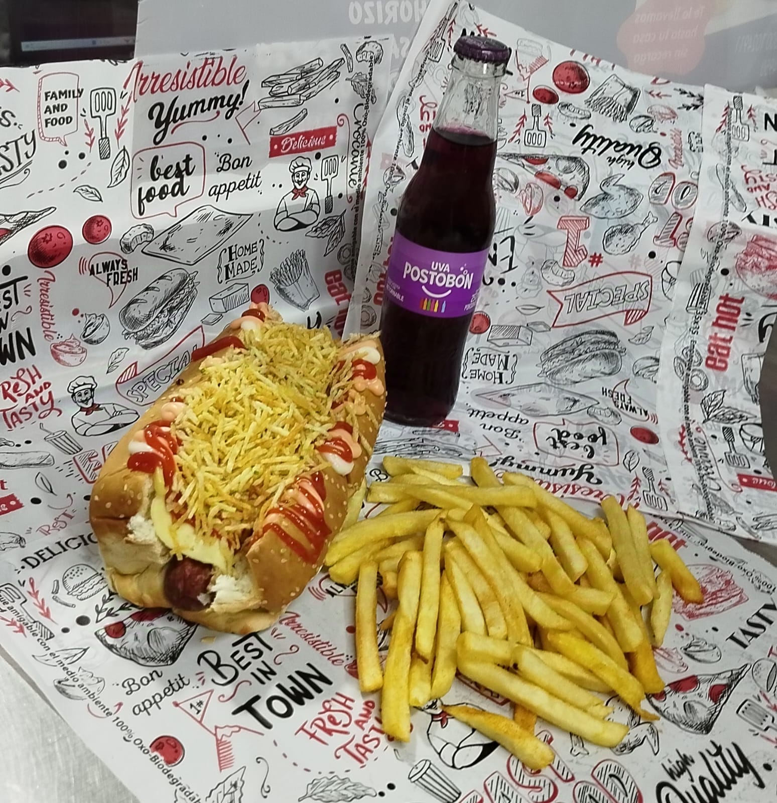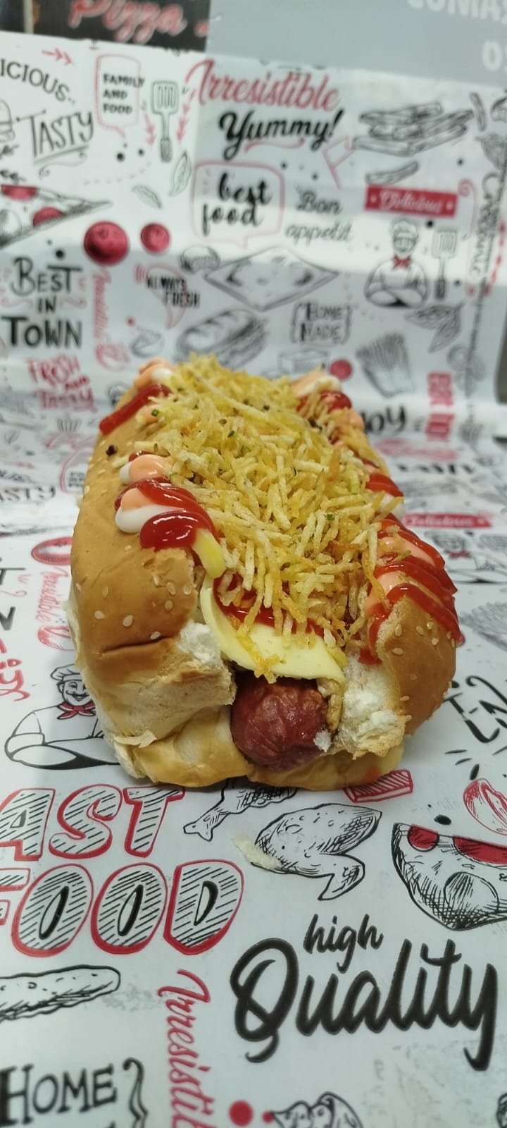 Salchicha americana, cebolla, pollo, champiñón, queso, salsa y papa chip.