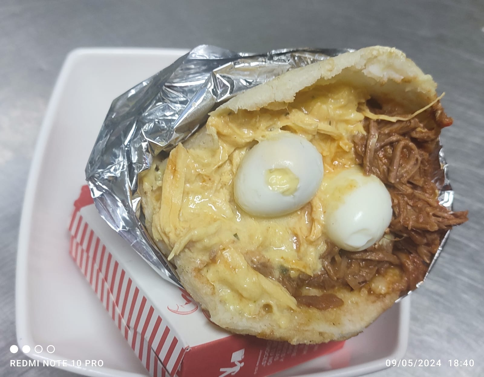 Mixta pollo curry, carne desmechada, queso y dos huevos de codorniz.