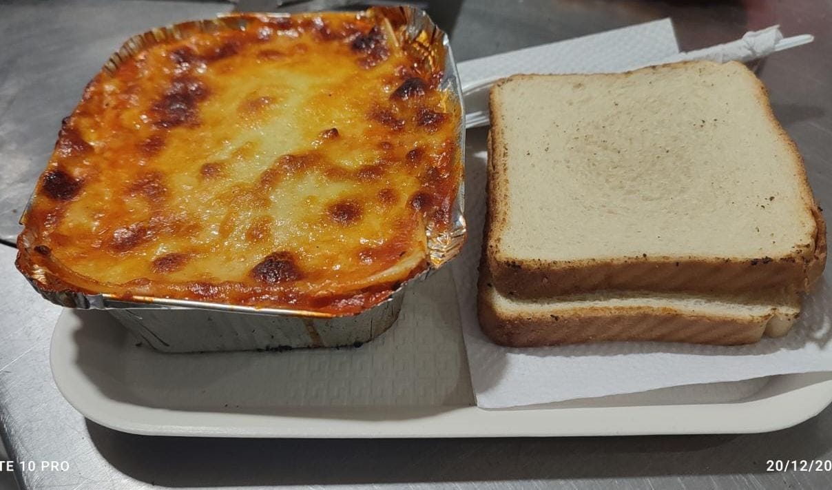 Pollo, carne, pasta, salsa de la casa, queso y dos panes con ajo.