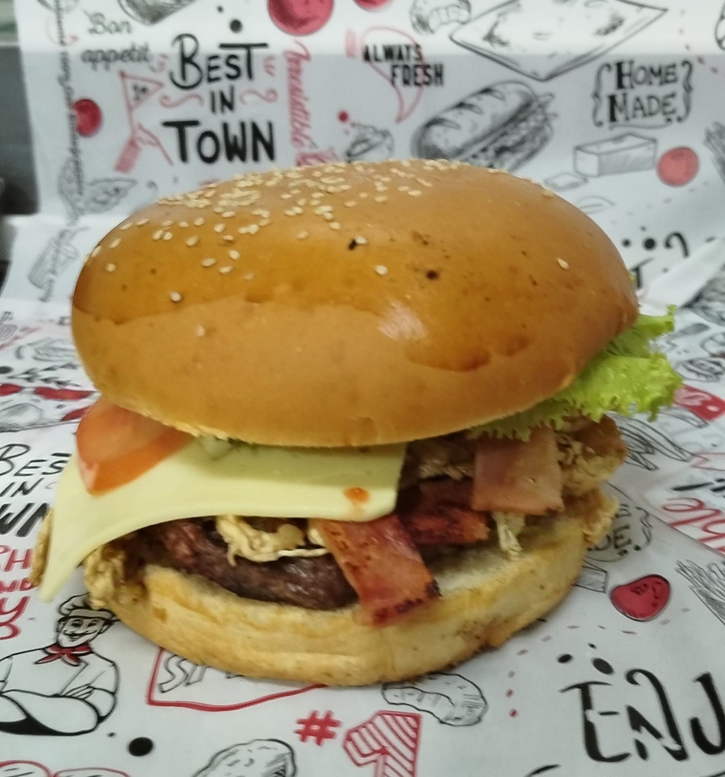 Pan, salsa, carne, tomate lechuga, cebolla grille queso y adicional pollo tocineta.