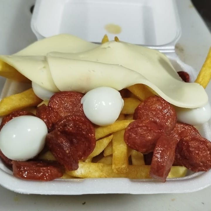 Salchicha americana, papa francesa 200 g, 4 huevos de codorniz y queso.