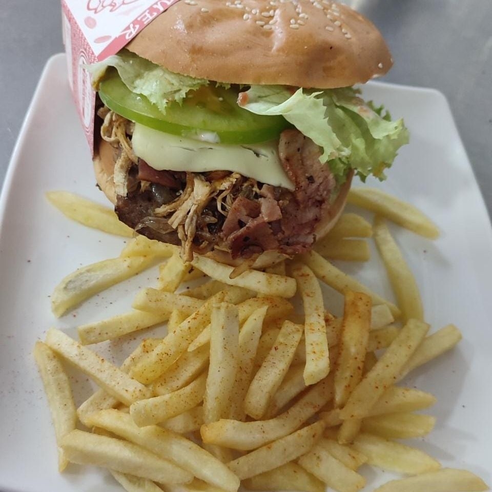 Pan, salsa, carne, tomate lechuga, cebolla grille, queso y adicional pollo tocineta.
