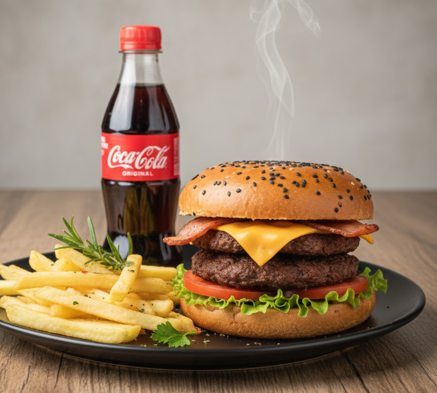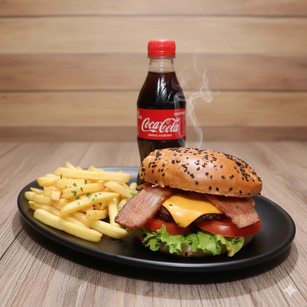 Carne artesanal 120 g, tocineta, plátano frito, queso costeño, pan brioche, queso doble crema, salsas (tomate, BBQ, de la casa), lechuga y tomate, papas a la francesa y gaseosa 250 ml (manzana, Colombiana, Pepsi).
