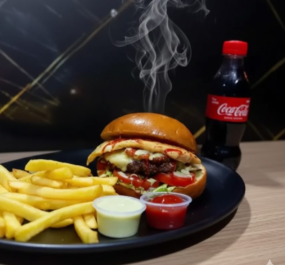 Carne artesanal 120 g, pollo 100g, , pan brioche, salsas (tomate, BBQ, de la casa), lechuga y tomate, papas a la francesa y gaseosa 250 ml (manzana, Colombiana, Pepsi).