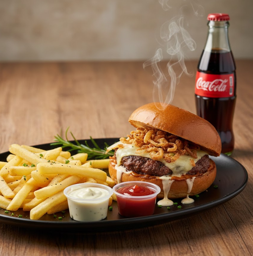 Carne artesanal 120 g, tocineta, cebolla crispy (caramelizada), pan brioche, queso doble crema, salsas (tomate, BBQ, de la casa), lechuga y tomate, papas a la francesa y gaseosa 250 ml (manzana, Colombiana, Pepsi).