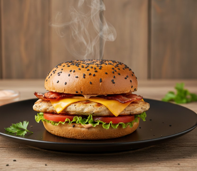 Filete de pollo 100 g, tocineta, pan brioche, queso doble crema, salsas (tomate, BBQ, de la casa), lechuga y tomate.