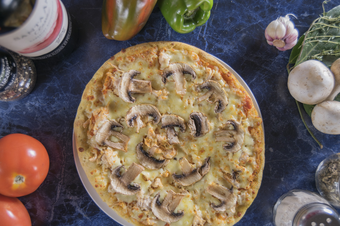Pizza con champiñón y pollo.