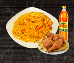 1 Pollo broaster, arroz chino, papas a la francesa y gaseosa 1,5 L (productos Postobón).