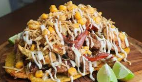 Delicioso patacon relleno con maiz dulce, queso gratinado, carne desmechada, pollo desmechado y huevos de codorniz