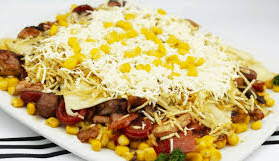 Exquisita mazorcada acompañada de carne desmechada, pollo mechado, queso gratinado papa chips y huevos de codorniz
