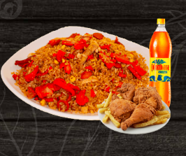 Arroz chino con raíces, jamón, cebolla y carne de cerdo más un 1/4 de pollo broaster y 2 gaseosas de 250 ml.