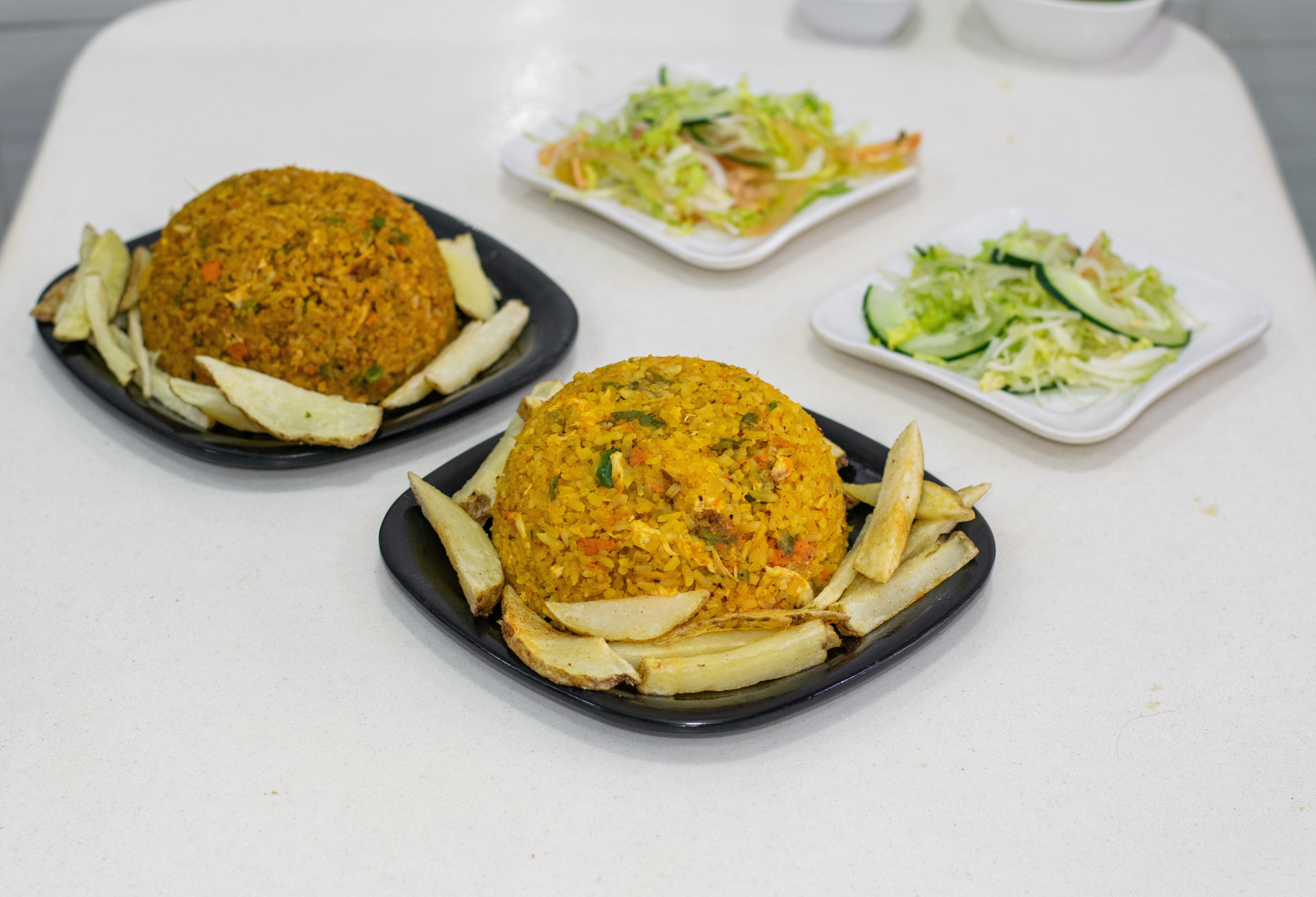 2 Arroz con pollo cada uno de 350 gramos, acompañado de 2 porciones de papa a la francesa artesanal y 2 ensaladas.
