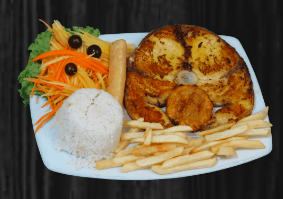 1 Pollo asado, arroz paisa y 1 porción de papas a la francesa.