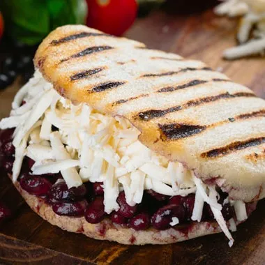 Arepa rellena con queso blanco rayado y caraotas (frijol negro). Tamaño a elección.