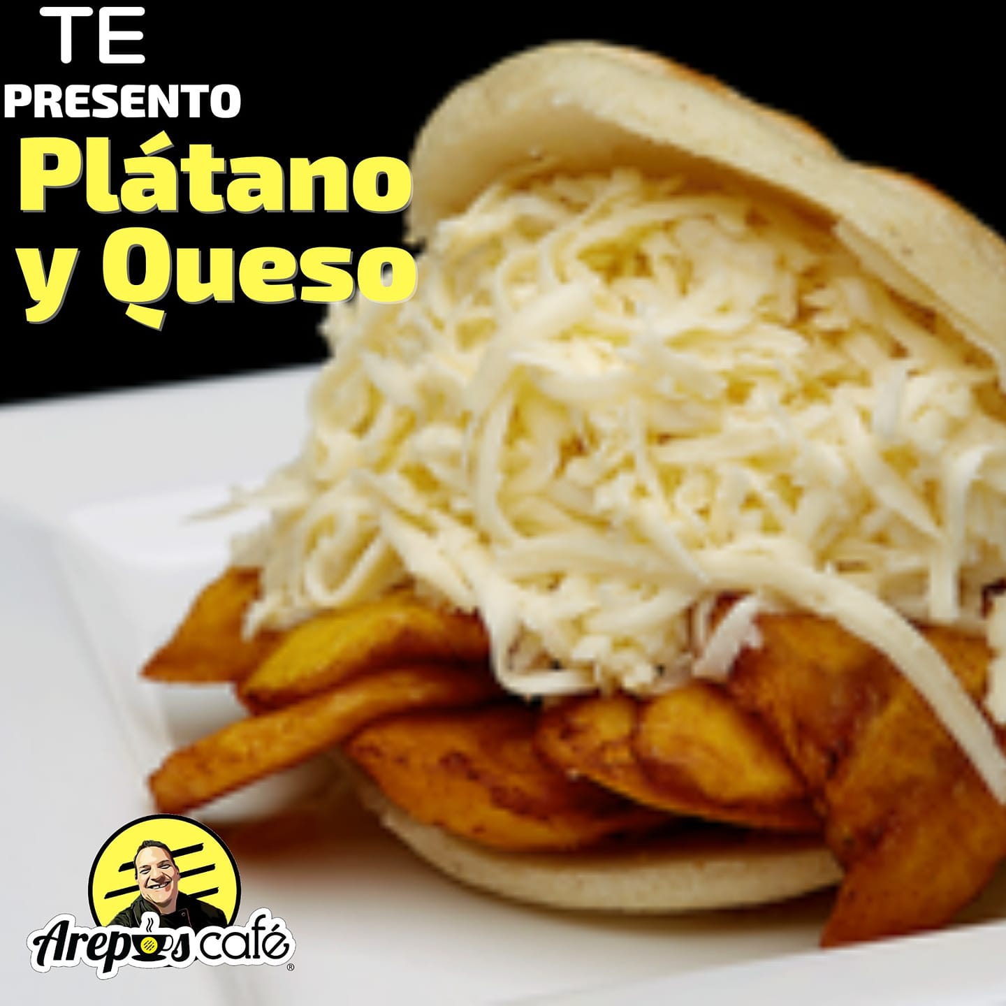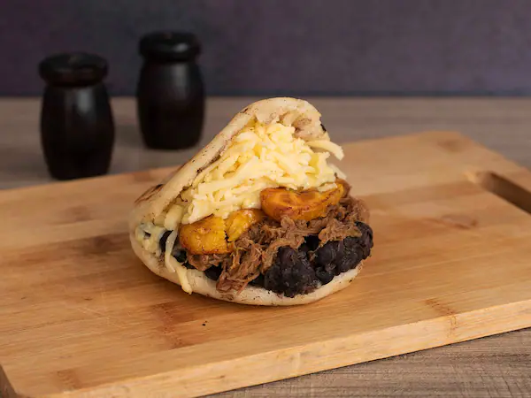 Arepa rellena con queso balnco rayado, plátano maduro, carne desmechada y caraotas (frijol negro). Tamaño a elección.