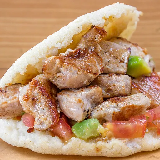 Arepa rellena con lomo de cerdo con aguacate y tomate. Tamaño a elección.