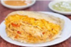Arepa rellena con huevos pricos con tomate y cebolla. Tamaño a elección.