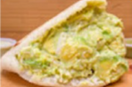 Arepa rellena con mezcla de aguacate, pollo desmechado y mayonesa. Tamaño a elección.