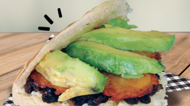Arepa rellena de aguacate, maduro, caraotas y queso blanco
