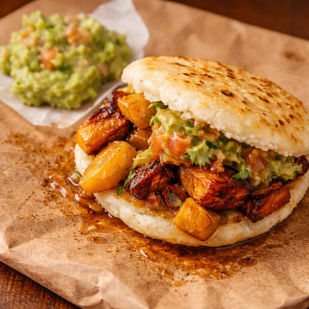 Arepa de Maíz, Rellena con Carne Desmechada Jugosa + Aguacate + Plátano maduro + Queso