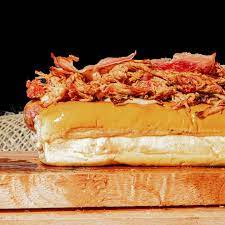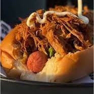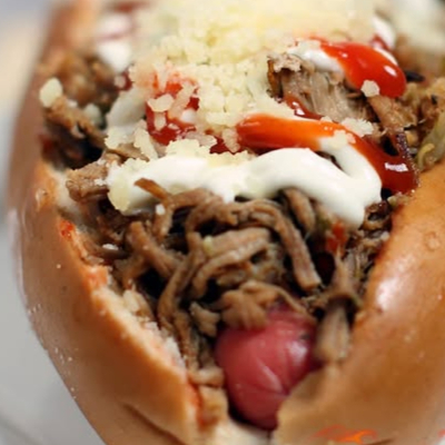PAN ARTESANAL DE PERRO CALIENTE, CON SALCHICHA TIPO AMERICANA, CERDO DESMECHADO, TOCINETA PICADA TOSTADA, PAPA CABELLO DE ANGEL, SALSA DE AJO Y SALSA ROSADA.