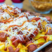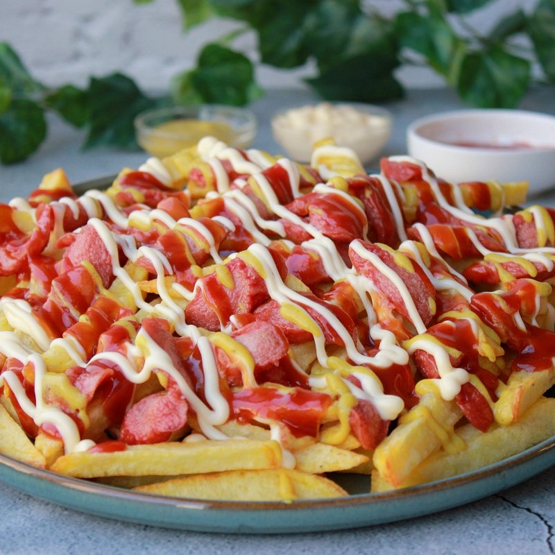 200 g De papas a la francesa, salchichas, huevos de codorniz, queso en brunoise, salsas.