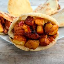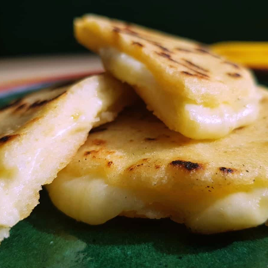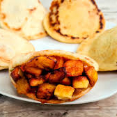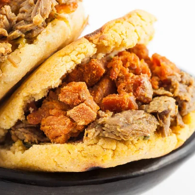 Deliciosa arepa rellena de carne en hogao, brunoise de plátano maduro frito y chicharrón carnudo en cubos.