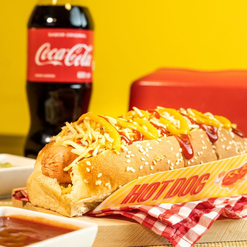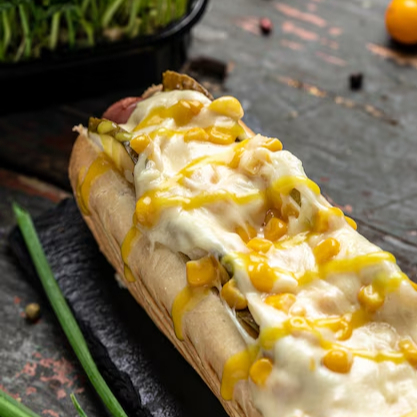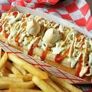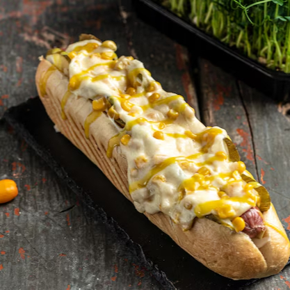 PAN ARTESANAL DE PERRO CALIENTE, CON SALCHICHA TIPO AMERICANA, POLLO DESMECHADO, TOCINETA PICADA TOSTADA, MAIZ, PAPA CABELLO DE ANGEL, SALSA DE AJO Y SALSA ROSADA.